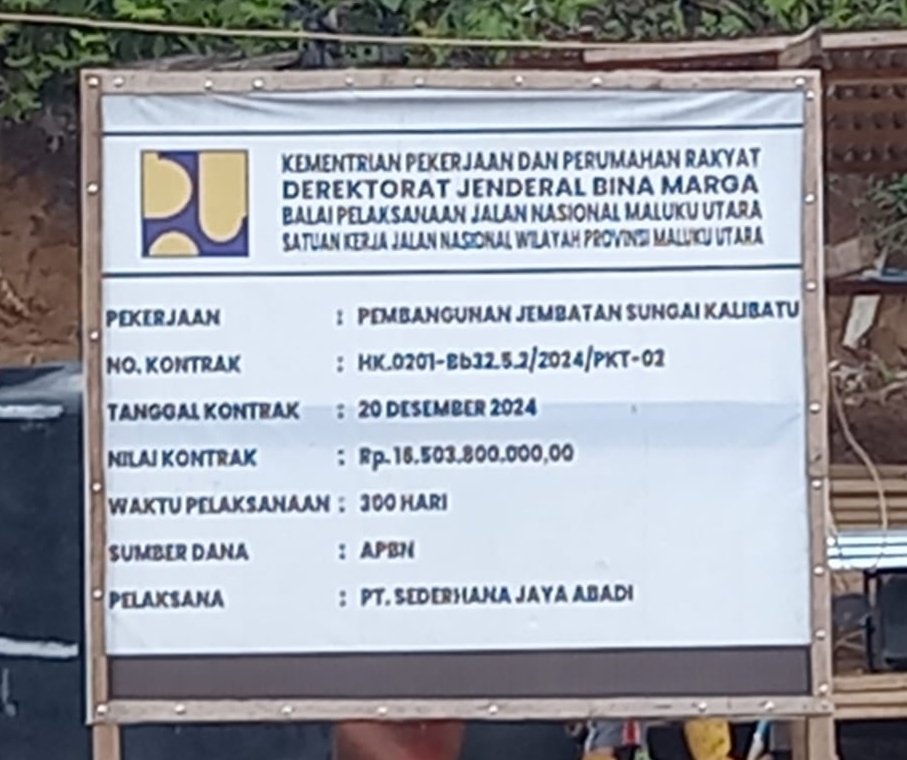 TERNATE,FORES INDONESIA- Proyek pembangunan Jembatan Kali Butu di Kecamatan Loloda, Kabupaten Halmahera Barat, Maluku Utara, kembali menuai sorotan. Investigasi Lembaga Pengawasan Pemberantasan Tindak Pidana Korupsi (LPP Tipikor) Malut menemukan adanya kejanggalan serius dalam proses tender dan kontrak proyek senilai Rp16,5 miliar yang dikerjakan PT Sederhana Jaya Abadi.